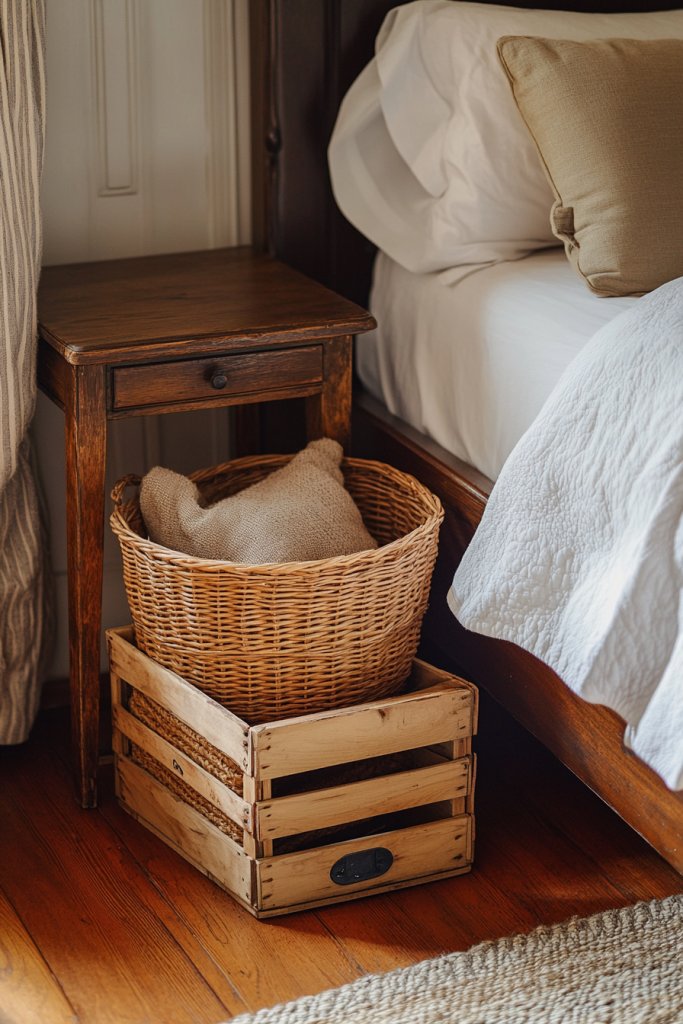 Visualize open woven baskets on shelves or under the bed, filled with blankets, shoes, or accessories. Wooden crates stacked on each other serve as bedside tables or decorative storage spots. The natural textures add warmth and rustic appeal, blending seamlessly with linen bedding and textured rugs. The mix of woven and wooden elements creates a layered, inviting look.