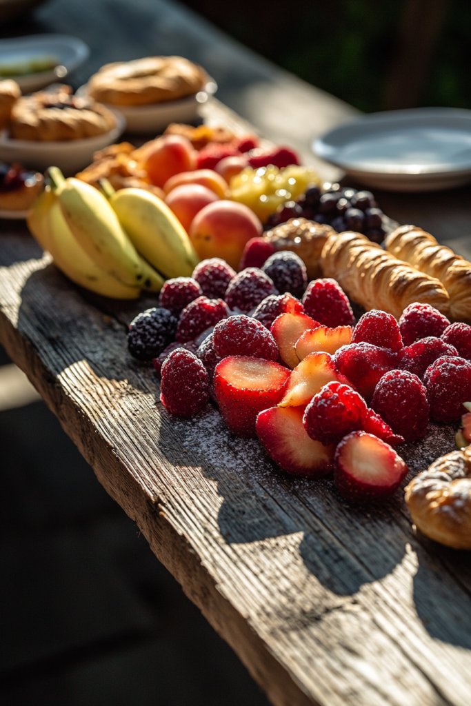 Imagine a weathered reclaimed wood board, its grain rich and inviting. Bright ripe berries spill over the edges, their vibrant reds and blues popping against the natural tones. Flaky croissants and miniature muffins sit nestled nearby, their golden crusts catching the morning light through a window. The textures of flaky pastry, juicy fruit, and rough wood create a warm, tactile scene that beckons everyone to dig in. It’s like a rustic farmhouse scene right on your table.