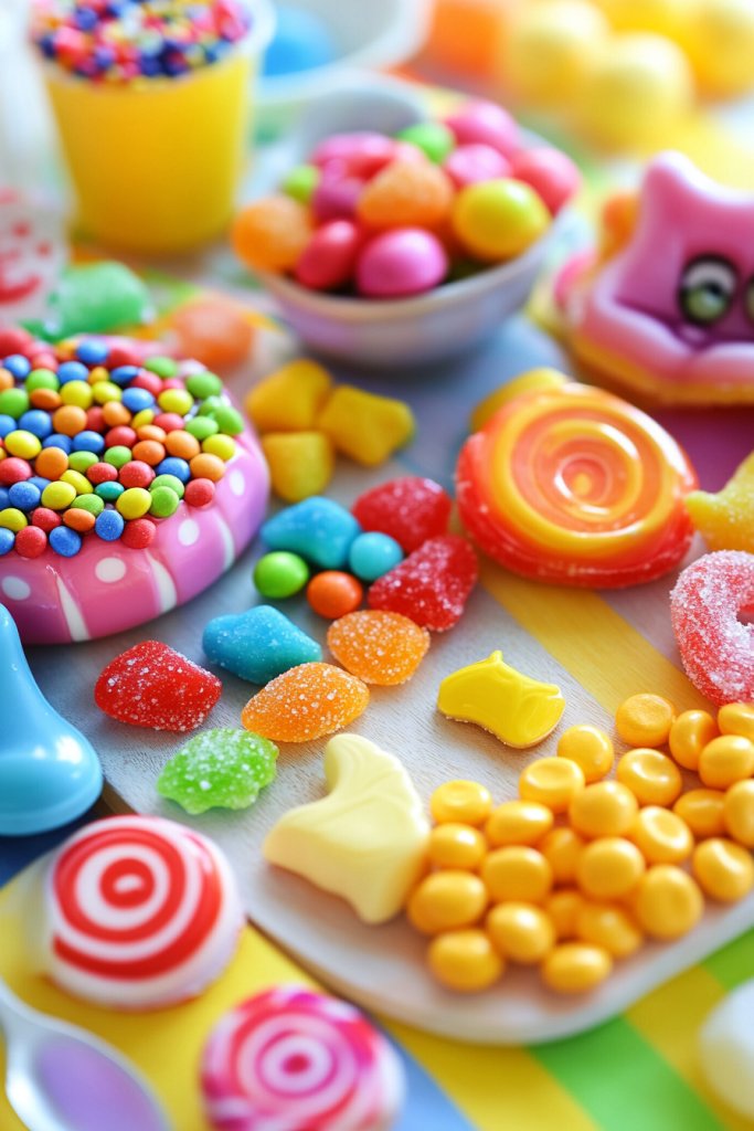 12. Whimsical Themed Board with Colorful Candies and Fun Shapes