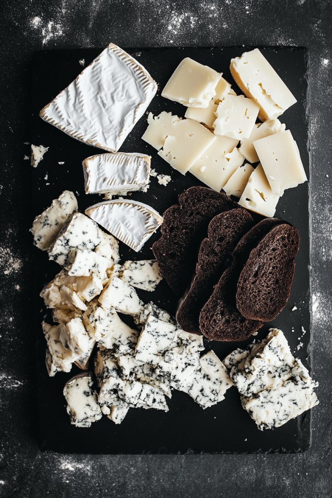 13. Sophisticated Black and White Contrast with Dark Breads and White Cheeses