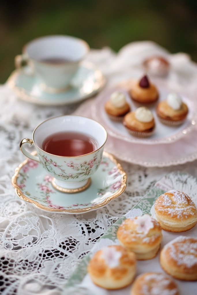 Envision a lace-trimmed tablecloth with mismatched vintage china cups and saucers. Tiny finger sandwiches, scones, and petite fruit tarts are arranged on tiered cake stands. Silver teaspoons and small dessert forks rest alongside delicate plates. Freshly brewed tea or coffee in ornate pots completes the scene. Soft pastel linens, fresh flowers, and lace doilies soften the look, creating a scene straight out of a vintage postcard. Every detail whispers elegance and grace.