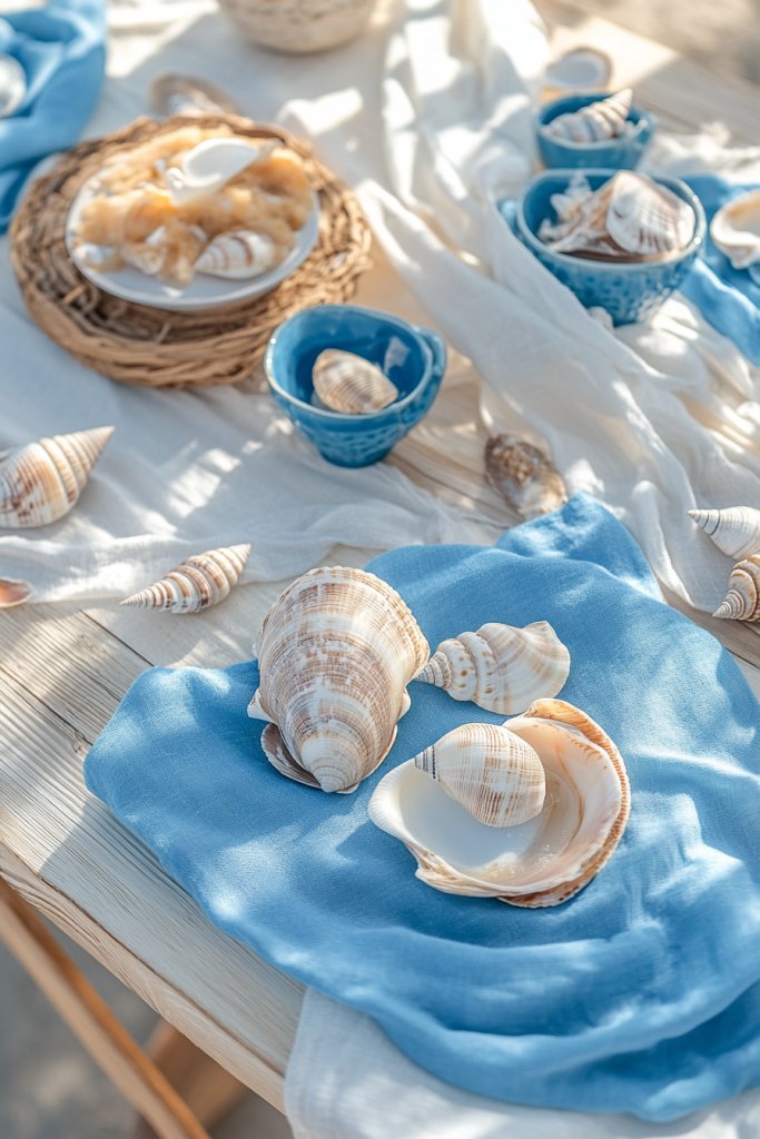 16. Bright and Airy Coastal Theme with Blue Accents and Shell Decorations