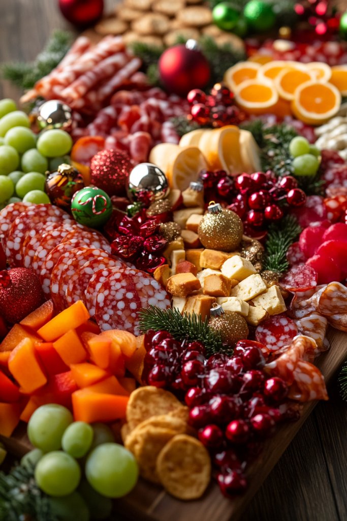 Visualize a beautifully arranged board with reds, greens, and golds—think pomegranate seeds, cherry tomatoes, and green grapes. Include baked goods decorated with holiday motifs—gingerbread, cookies with icing, or mini pies. Add seasonal touches like cinnamon sticks, candy canes, and edible gold glitter. Small festive ornaments or decorative picks can accentuate the scene. The overall look is joyful, colorful, and inviting—like a holiday market in your home.
