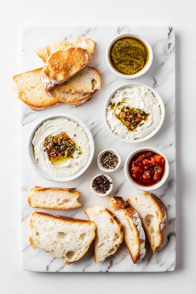 2. Minimalist White Marble Board with Mediterranean Dips and Breads