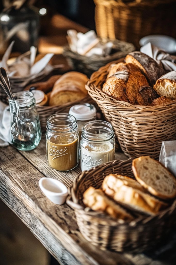 Start with a collection of glass mason jars—preferably with vintage labels or metal lids. Layer yogurt, granola, and fruit in each jar for a grab-and-go option. Fill baskets with freshly baked bread, scones, or muffins, and set out butter and preserves nearby. Use wooden or wire trays to hold larger items like croissants or bagels. Decorate with small cloth napkins and vintage utensils. Keep baked goods warm in a low oven or covered basket. The overall goal is to evoke a farm-to-table feel that’s both functional and charming.