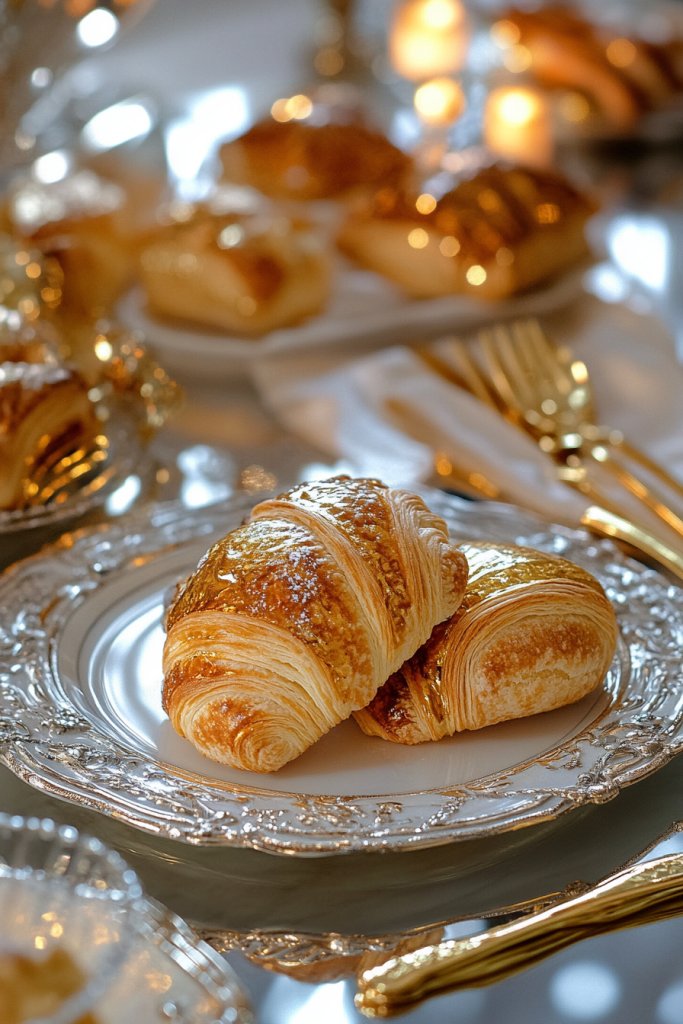 Imagine a sleek tray lined with white porcelain plates edged in gold. Flaky croissants, delicate fruit tarts, and éclairs are arranged artistically, their glossy finishes catching the light. Small gold spoons, forks, and knives are set alongside, gleaming and ready for use. Crystal glasses filled with fresh juice or sparkling water add elegance. Subtle touches like gold-rimmed cups and delicate lace doilies complete the scene. The overall look is refined, inviting, and rich with texture, perfect for a sophisticated start to the day.