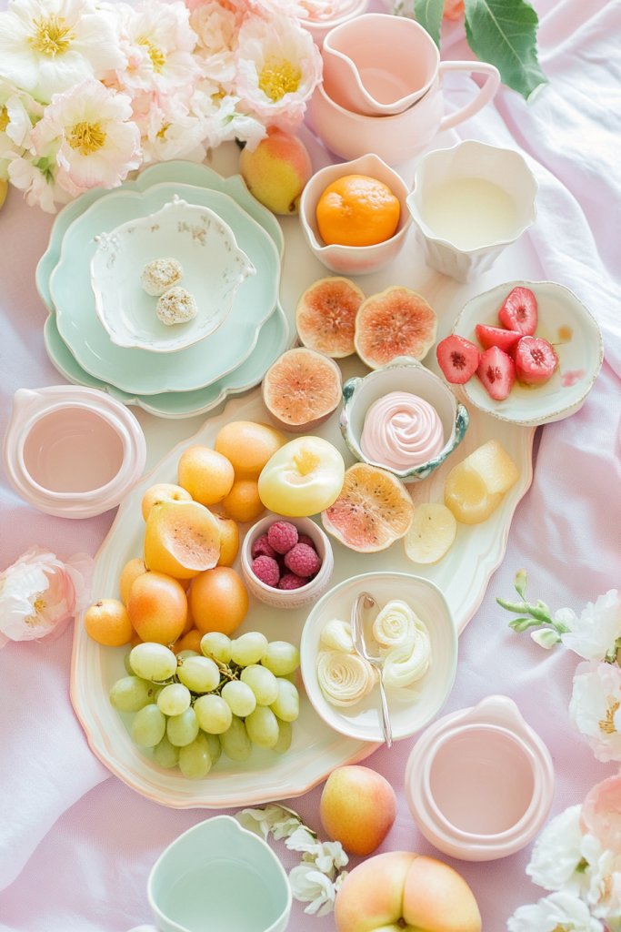 This concept works beautifully for springtime brunches or baby showers. Swap out fruits for berries and add floral accents for extra charm. For fall, incorporate muted earthy tones with pumpkin or apple hues. Use pastel-colored plates and utensils, or keep it monochrome with white and soft shades. You can also layer textures with embroidered linens or decorative paper doilies. The key is to keep everything in a soft, coordinated color scheme.