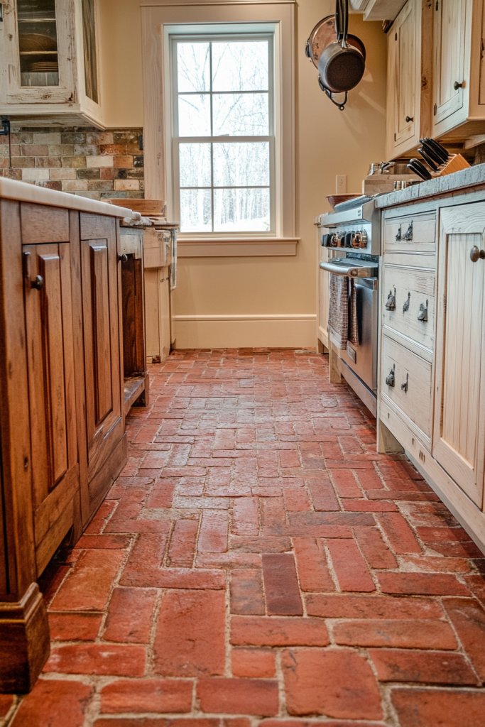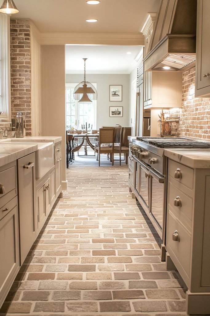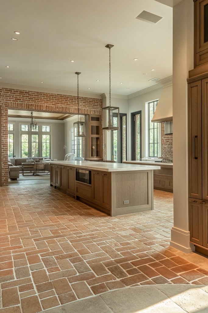 14. Open-concept Kitchen with Brick Flooring for Seamless Flow