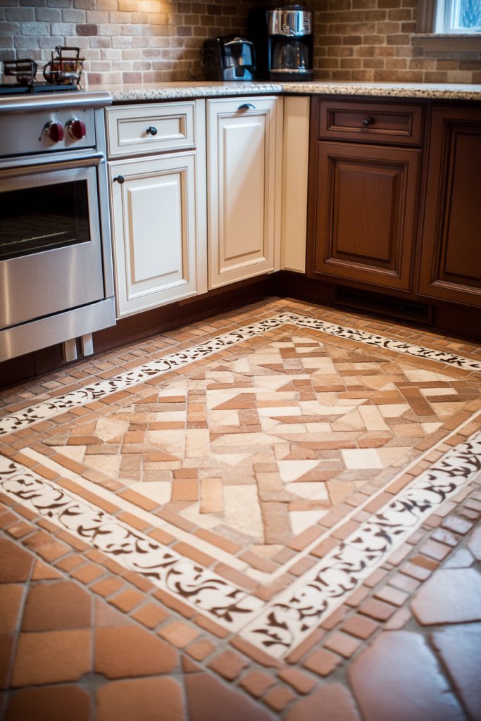 Imagine a checkerboard or intricate mosaic pattern created with different brick colors or sizes, framed by a decorative border. The border could feature contrasting bricks, detailed inlay, or even small accent tiles. The pattern draws the eye and adds a sense of movement, transforming a plain floor into a focal point. Paired with simple cabinetry, this design becomes a statement of personality.