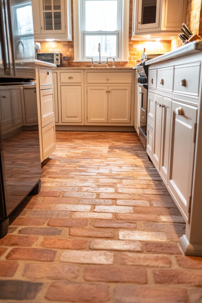 Brick floors paired with glass or metal accents deliver a fresh, modern aesthetic that feels both warm and sleek. They add a touch of luxury and sophistication while showcasing your unique style. This combination creates a layered visual experience that ages well over time. Ready to elevate your kitchen design? The right mix of rustic and refined will turn your space into a true showstopper.