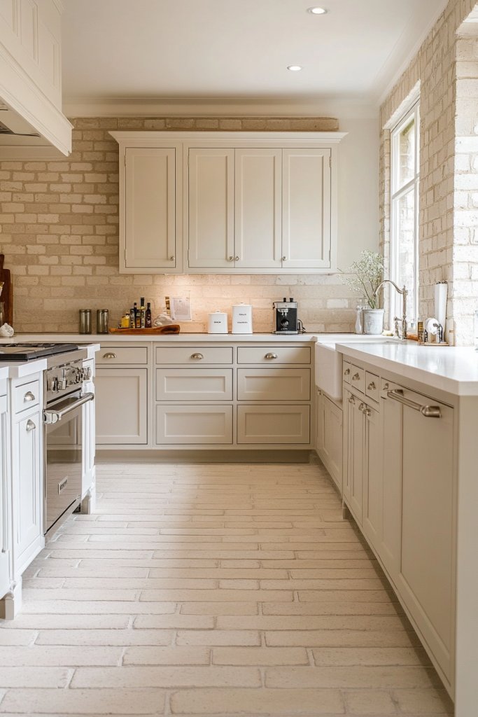 Light beige brick floors create a peaceful, versatile foundation for your kitchen. They enhance natural light and complement a wide range of decor choices. It’s a timeless, easy-to-maintain option that suits every season and style. Want a space that feels calm and inviting? This neutral palette provides the perfect canvas for your design dreams. Your kitchen will radiate understated elegance and comfort.
