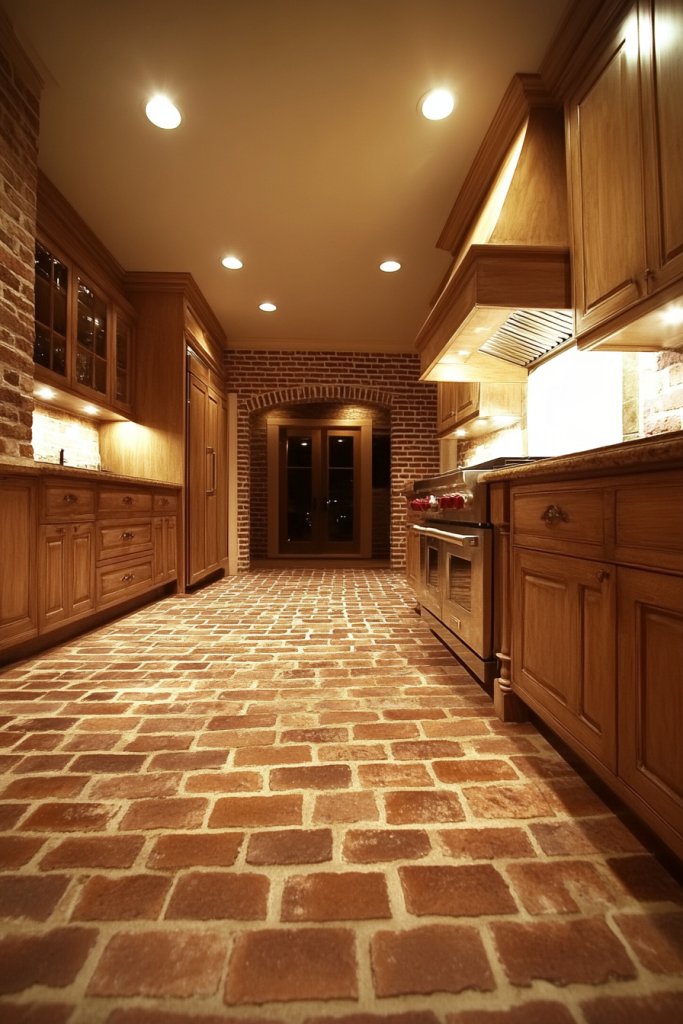 16. Brick Floors with Recessed Lighting for Warm Ambiance