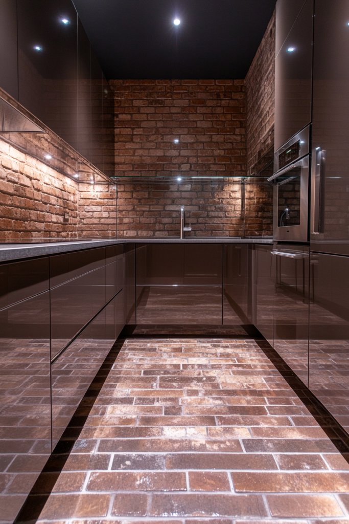 Picture a textured brick floor paired with a glass backsplash that reflects light, adding brightness and depth. Alternatively, a brushed metal backsplash—think copper or stainless steel—adds a cool, industrial edge. The reflective surfaces contrast beautifully with the rough texture of bricks, creating a layered, dynamic aesthetic. This combination enhances both rustic and modern character, making your kitchen feel curated and stylish.