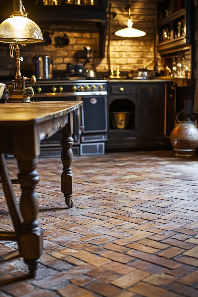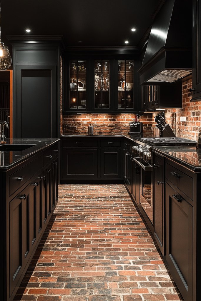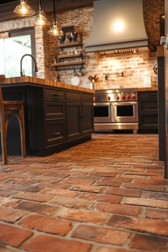 4. Brick Flooring Paired with Dark Cabinetry for Contrast
