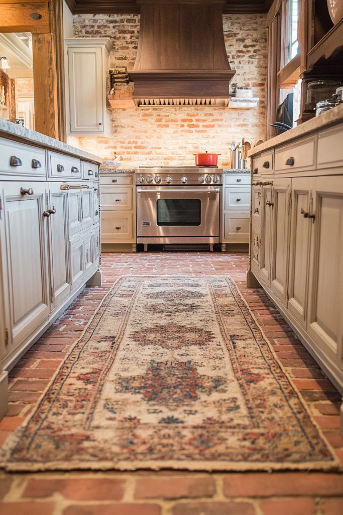 Want to add warmth and texture to your brick floor without overwhelming the space? Layering with vintage rugs or mats introduces softness and visual interest, making your kitchen cozy and inviting. It’s about combining durability with comfort in a way that’s both practical and stylish. If you love the idea of mixing hard surfaces with plush textiles, this is your go-to.