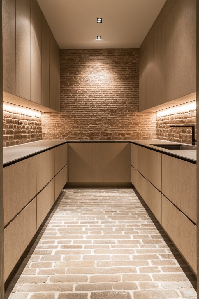 Add visual interest with textured textiles or subtle decorative details—think monochrome ceramics or sculptural elements. Incorporate lighting that enhances the depth of the brick tones, such as soft LED ambient lights. Play with different textures in your cabinetry, countertops, or wall coverings for a layered effect. Personal touches like engraved hardware or subtle art can personalize the space without breaking the harmony.