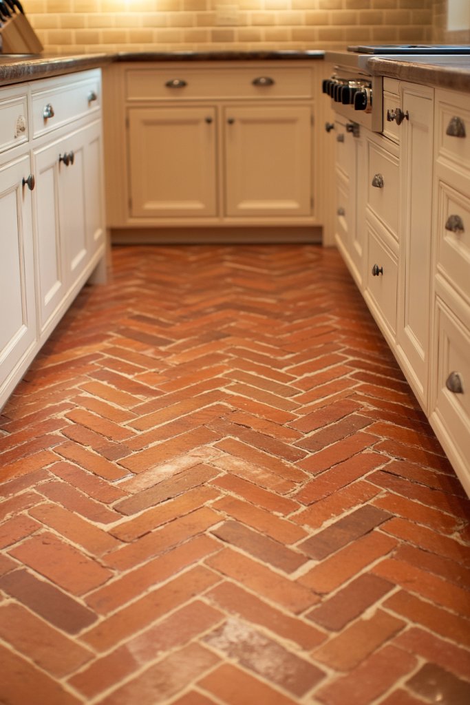 Visualize bricks laid in a zigzag, chevron-style pattern that draws your eye across the floor. The arrangement creates a sense of movement and depth, making even small kitchens appear more expansive. The natural variations in brick tones enhance this effect, adding richness and texture. Paired with simple cabinetry and understated fixtures, the pattern becomes a focal point that adds personality and polish.