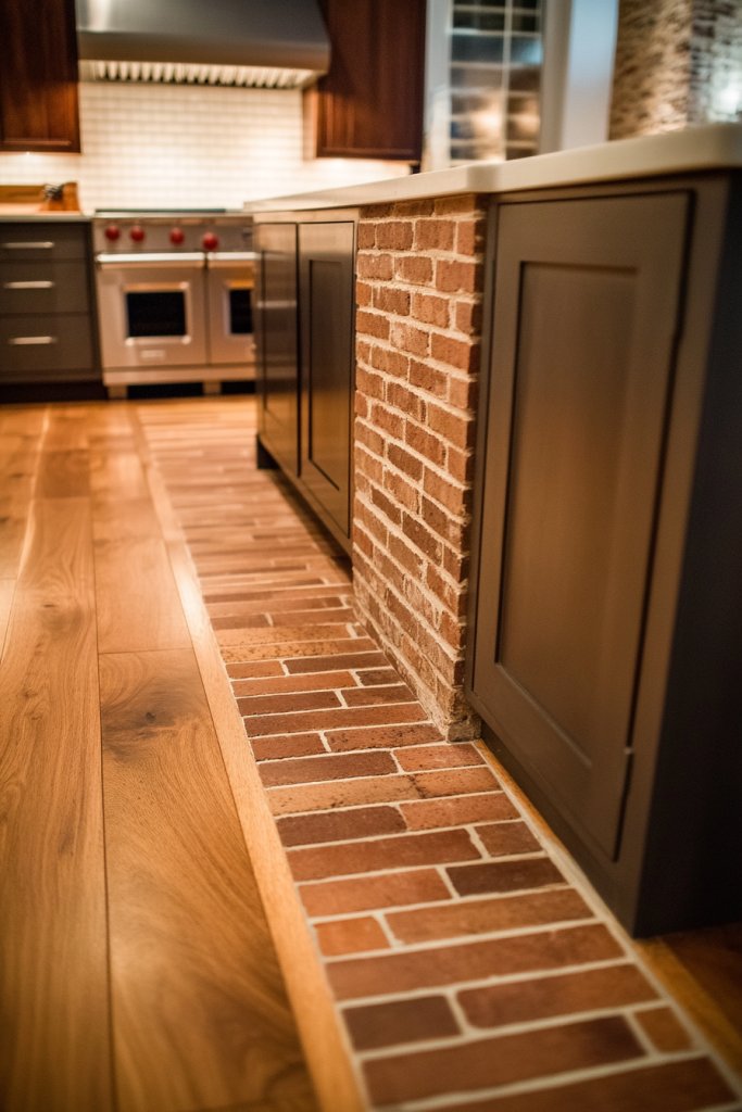 Picture a section of brick flooring transitioning into a warm, honey-toned hardwood strip or mat. The rough texture of the bricks contrasts beautifully with the smooth, polished wood, creating a tactile experience underfoot. This layered approach can define different zones within an open-plan kitchen—like a cooking area versus a breakfast nook. Natural light enhances the interplay of textures, highlighting the unique qualities of both materials.