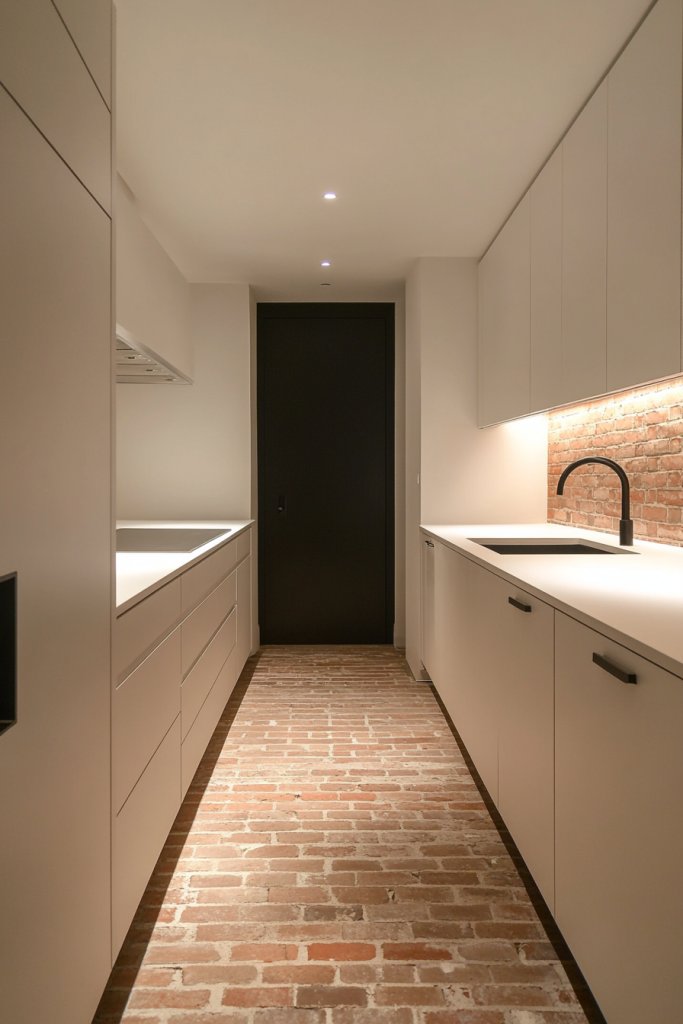 21. Minimalist Kitchen Design with Brick Floors as a Focal Point