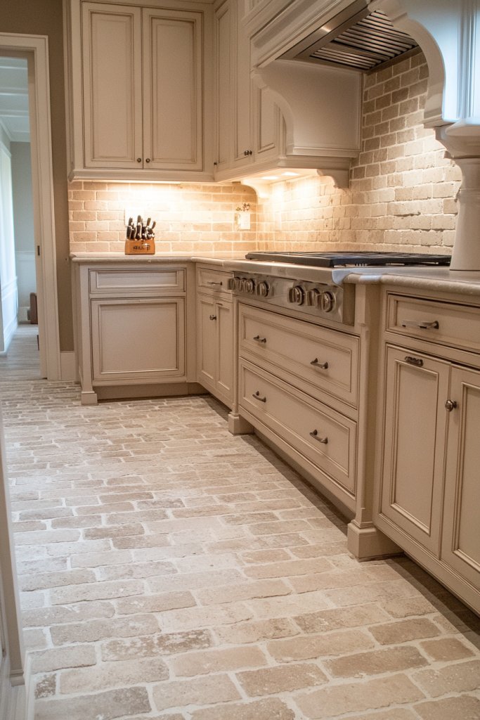 Want a versatile, calming foundation for your kitchen? Light beige brick flooring provides a soft, neutral palette that pairs beautifully with nearly any decor style. It’s perfect if you prefer a subtle backdrop that enhances natural light and creates a peaceful environment. If you’re after a timeless, understated look, this idea is a great choice.