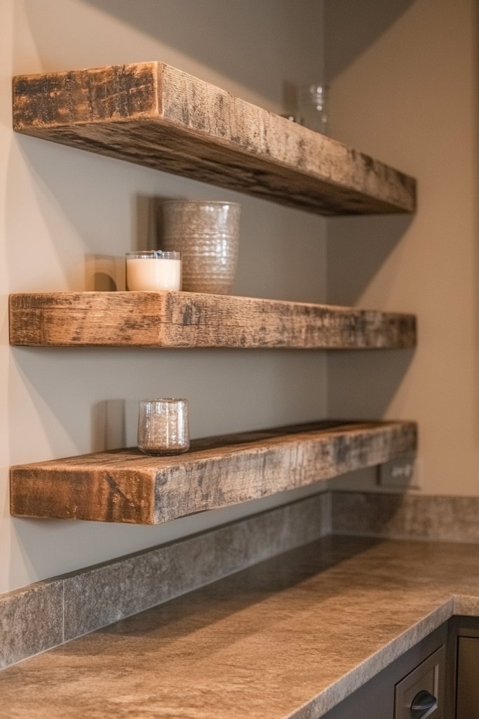 Reclaimed wood shelves work well in both modern and traditional kitchens. You can opt for floating styles or add brackets for a more structured appearance. Seasonal accents like woven baskets or fabric-lined trays can change the vibe. For smaller spaces, a single open shelf can serve as a statement piece, while larger kitchens benefit from multiple tiers.
