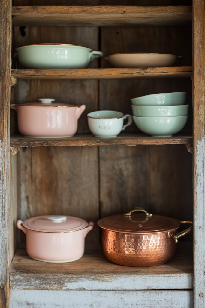 Visualize a collection of colorful enamel teapots, bowls, and copper saucepans arranged on open shelves. The worn paint and shiny copper surface develop a lovely patina over time. These items add vibrant pops of color and shine, contrasting beautifully with matte cabinetry and weathered wood. The mix of textures creates a lively, lived-in atmosphere.