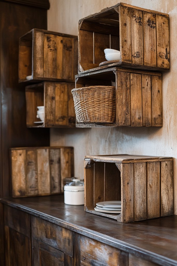 Imagine stacked or mounted crates with rough edges and weathered finishes, filled with colorful dishes, jars, or cookbooks. The imperfect surfaces and varied sizes create an eclectic, handcrafted look. This DIY approach adds a sense of history and authenticity, making your kitchen uniquely yours. The natural wood tones warm up the space and invite curiosity.