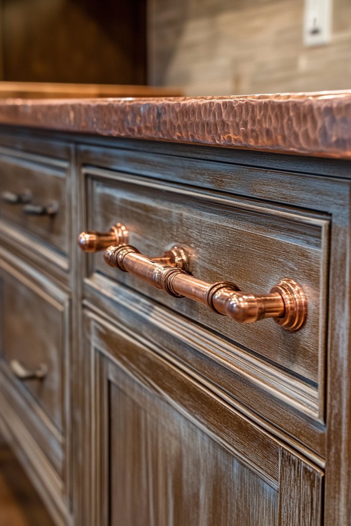 Create a cohesive look by coordinating hardware across all cabinets and drawers. Incorporate matching copper pendant light fixtures or small decorative accessories. You can also add copper accents like a spice rack, utensil holder, or small trinkets to reinforce the vintage vibe. Personal touches like engraved initials or custom shapes make your fixtures uniquely yours.