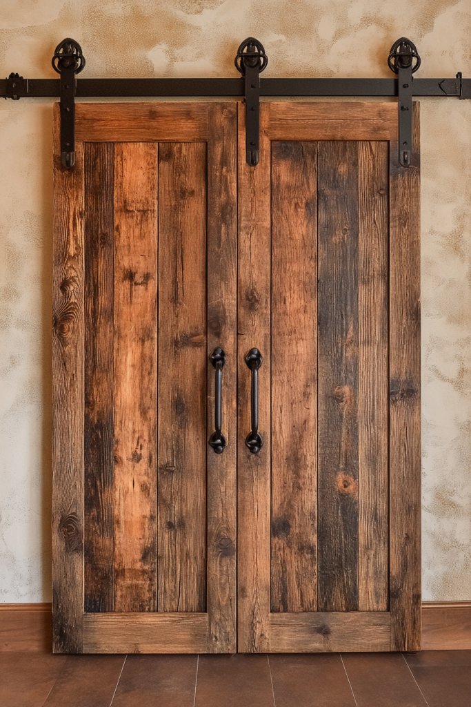 Picture distressed wood panels sliding smoothly on black metal tracks, reminiscent of classic barn doors. The weathered finish adds texture and authenticity, contrasting beautifully with smooth cabinetry. When open, they reveal an organized pantry or storage area, while closed they enhance your rustic aesthetic. The metal hardware and hardware details add a touch of industrial chic.