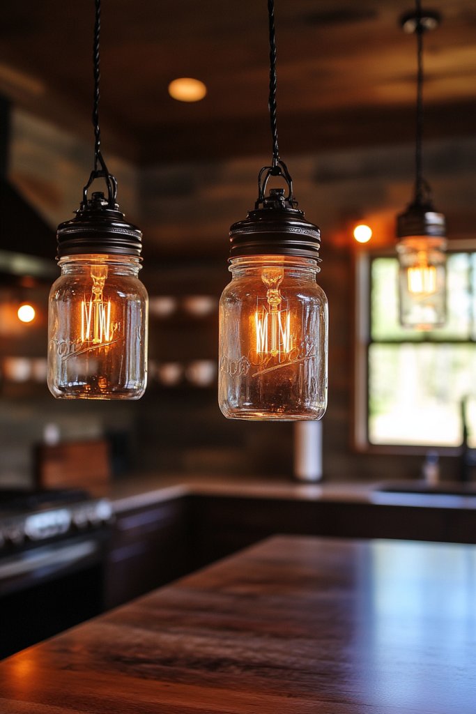 Hang multiple jars in a cluster over a kitchen island or dining table for a statement effect. Use colored or frosted jars for softer lighting. Incorporate vintage-style bulbs for maximum nostalgic appeal. For a more industrial look, opt for metal cage covers or black fittings. These fixtures work well in open-plan spaces or as accents in smaller kitchens.