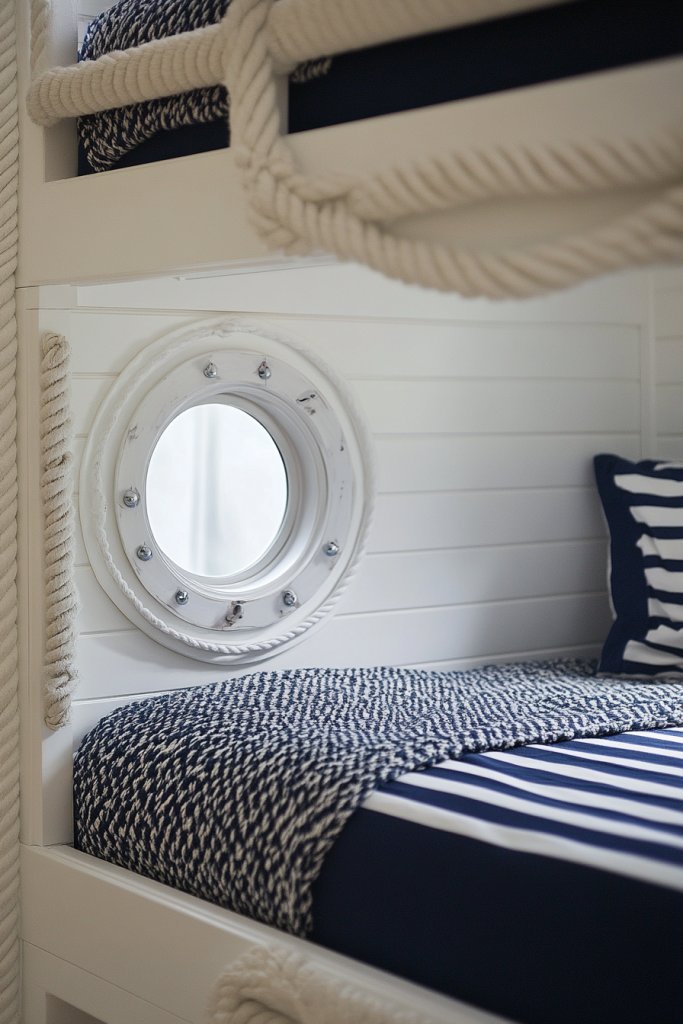 10. Nautical-Inspired Bunk with Rope Accents and Porthole Windows