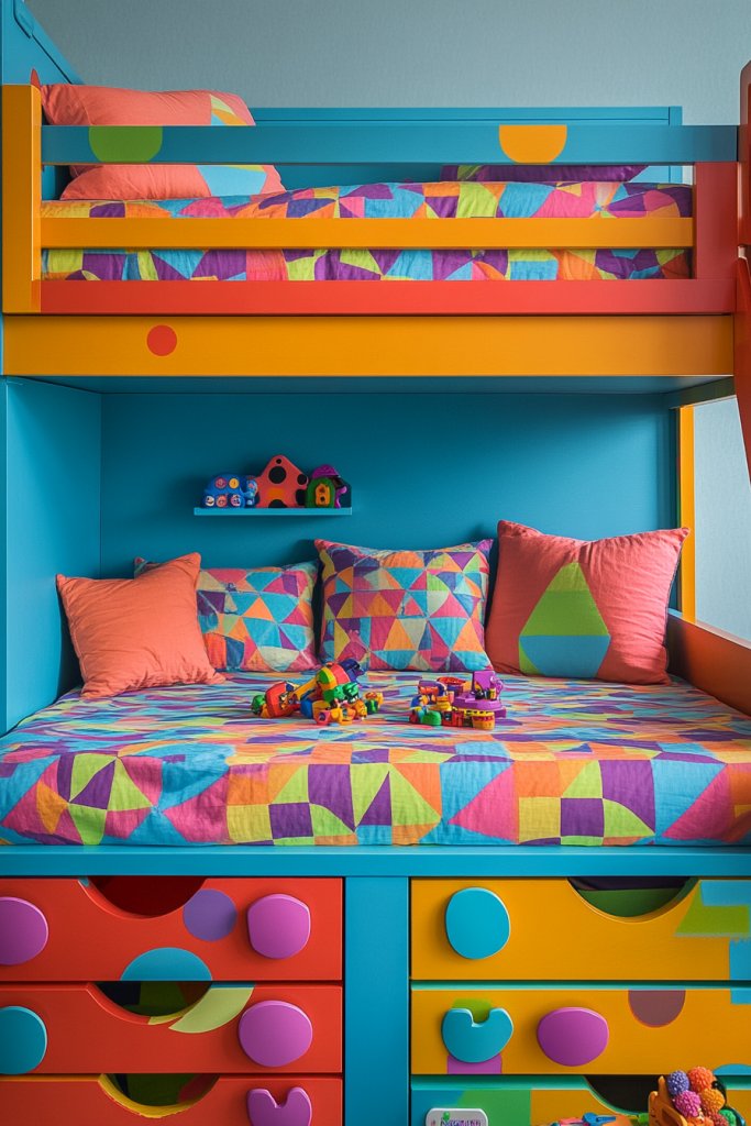 12. Colorful Bunk with Built-In Storage and Playful Patterns