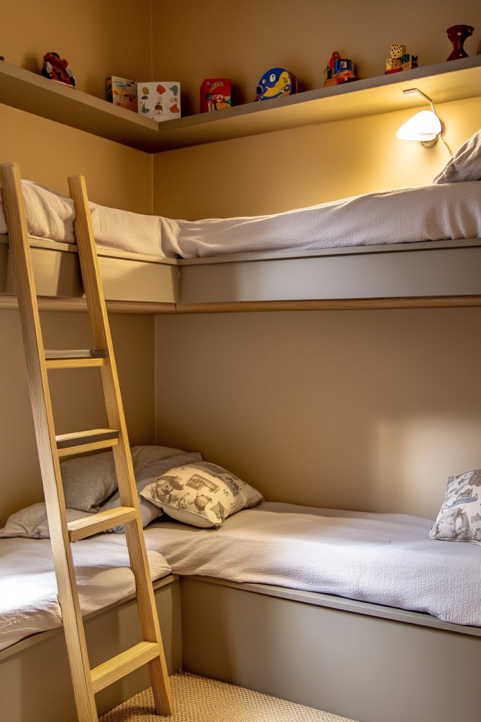 Limited space in a room can feel like a nightmare—unless you use every corner wisely. Corner bunks with ladders and wall-mounted shelves turn awkward spaces into functional zones. They maximize floor space and add a touch of architectural interest. Who says corners are just for furniture?