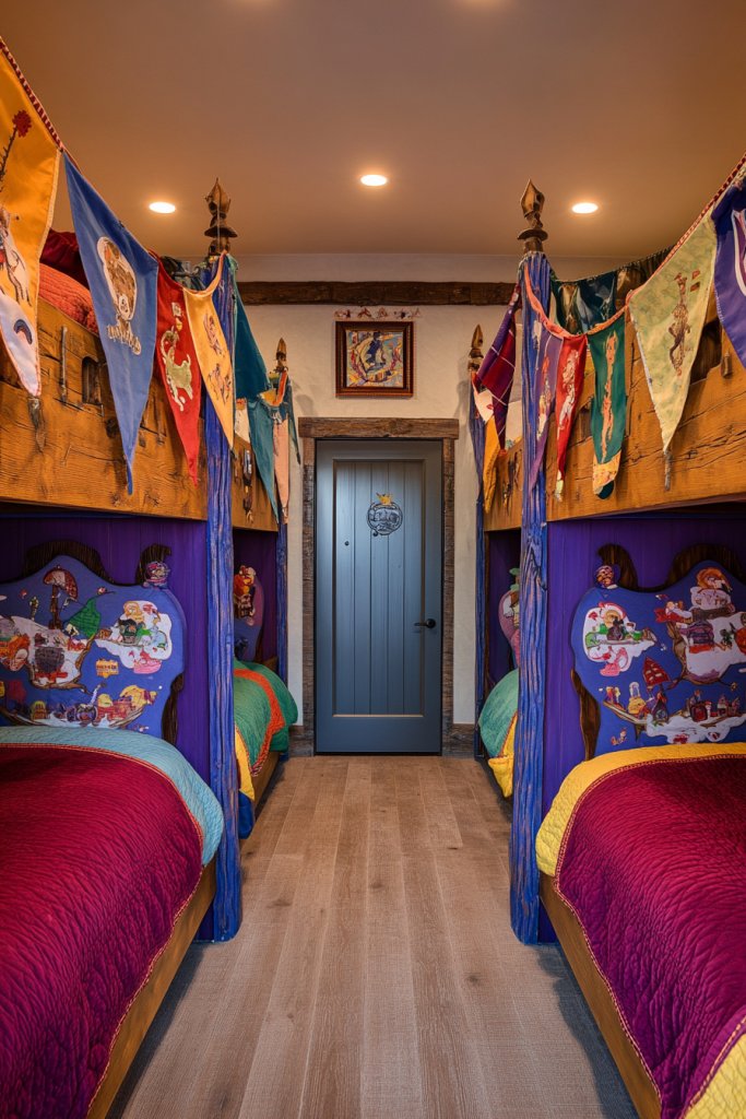 Visualize beds with personalized headboards featuring space rockets, jungle animals, or fairy tale castles. The room’s decor echoes the theme with matching bedding, curtains, and accessories. Walls might be painted or decorated with decals that enhance the story—think stars, trees, or clouds. The overall vibe is immersive and fun.