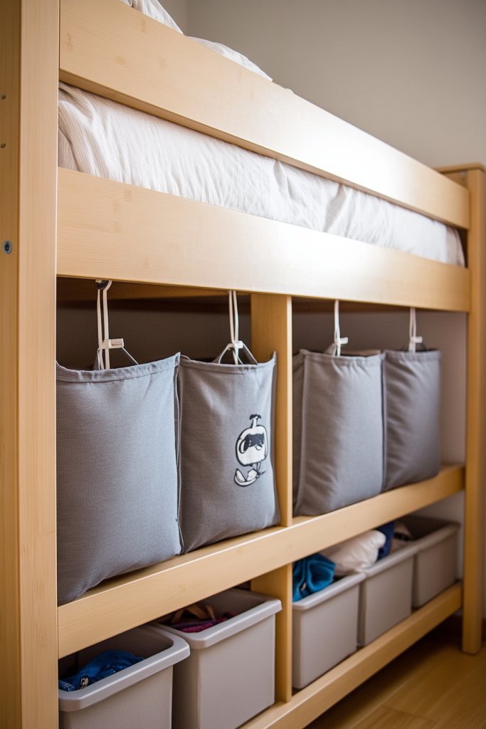 Select a loft bed with integrated storage options or add modular cubes to an existing bed. Secure cubes firmly to prevent tipping, and hang organizers at accessible heights. Use sturdy, washable fabrics for organizers to withstand wear. Organize contents logically—clothes in one, toys in another. Install lighting as needed for nighttime visibility.