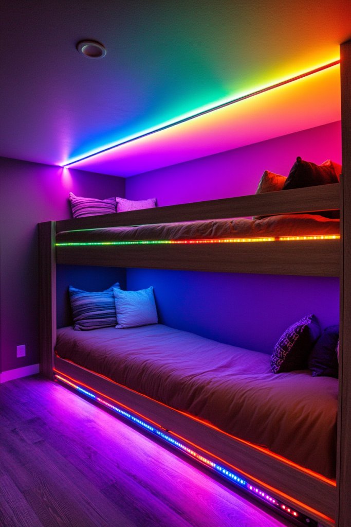 19. Bright Bunk Room with Multi-Color Lighting and LED Strips
