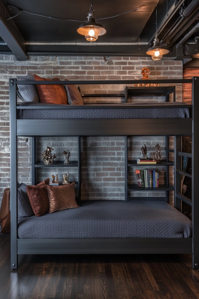 Mix metal with reclaimed wood for a softer touch or keep it all metal for a more rugged look. Paint the frames in matte black, gunmetal, or metallic finishes to match your aesthetic. Use industrial-style lighting fixtures like wall sconces or cage pendant lights (avoiding traditional pendant lights) to complement the theme. These beds work well in urban apartments or modern kids’ rooms.