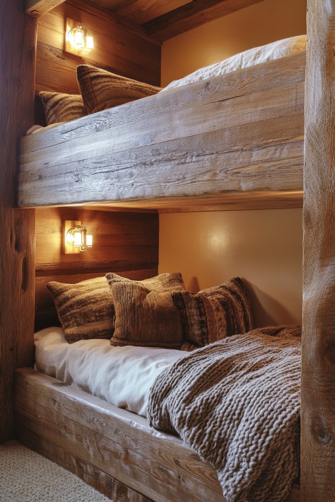 5. Rustic Wooden Bunks with Built-In Reading Lights