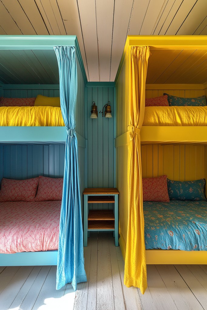 Imagine a rainbow of bunk beds, each painted in bold colors like turquoise, yellow, or coral. The bedding features lively patterns—stripes, polka dots, or cartoon motifs—adding personality. Built-in storage drawers or cubbies keep toys and clothes organized. The room feels energetic, inviting, and full of personality.