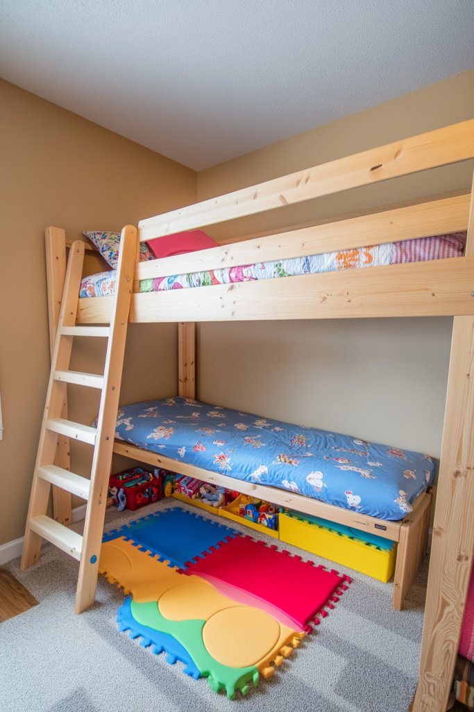Imagine a sturdy, well-built double-decker with high guardrails for safety and wide, cushioned steps for easy access. The beds are dressed in colorful, durable bedding, and the room features bright walls with playful decals. The design balances safety with a playful vibe, turning a small space into a fun, secure sleeping zone.