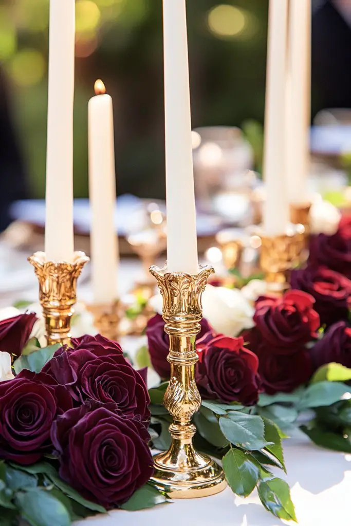 1. Elegant Gold Candle Holders with Burgundy Roses and Greenery