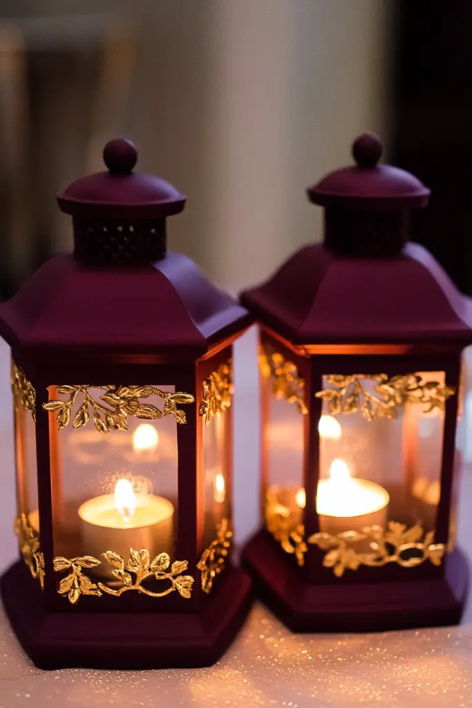 Imagine deep burgundy lanterns with delicate gold leaf patterns that shimmer subtly under candlelight. The flickering tea lights inside cast a warm, amber glow, bouncing softly off the metallic accents. The lanterns are arranged in a cluster or line, creating a pathway or focal point. The combination of deep colors and metallic shimmer evokes a sense of warmth and elegance perfect for fall or winter celebrations. It feels both intimate and regal.