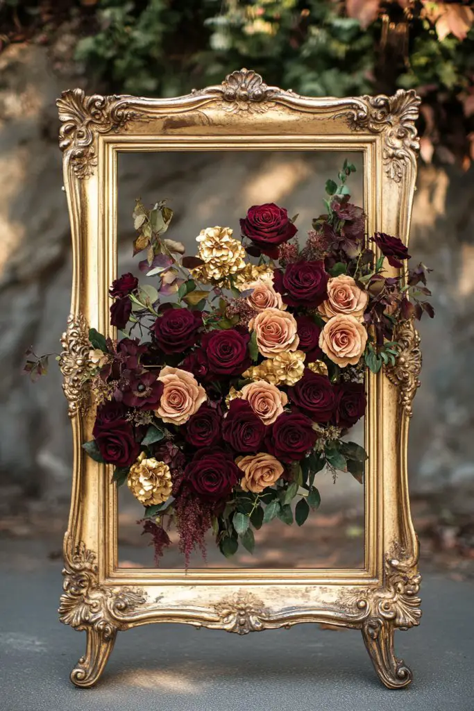 Visualize an ornate vintage gold frame standing upright or hung as a backdrop. Inside or behind it, lush arrangements of burgundy roses, gold chrysanthemums, and greenery spill out or are arranged neatly. The frame’s intricate details add texture and depth, making the entire setup feel like a piece of art. The rich colors and antique finish evoke a sense of history and grandeur. It’s a centerpiece that commands presence and admiration.