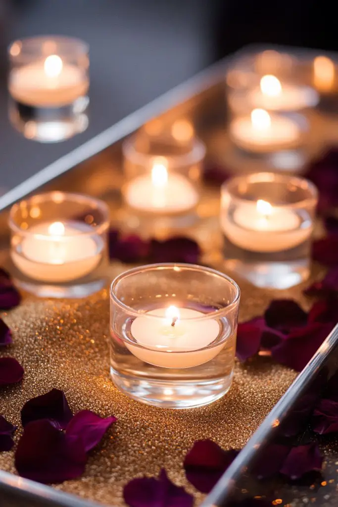 Start with a shallow gold tray or dish, filling it with fine gold sand or glittered sand. Scatter burgundy flower petals evenly over the sand. Place floating candles in small, clear glass holders and arrange them across the base, ensuring stability. Light the candles just before your event to maximize the glow. For a more dramatic effect, add small decorative elements around the candles. Keep the setup clean and safe, especially if outdoors.