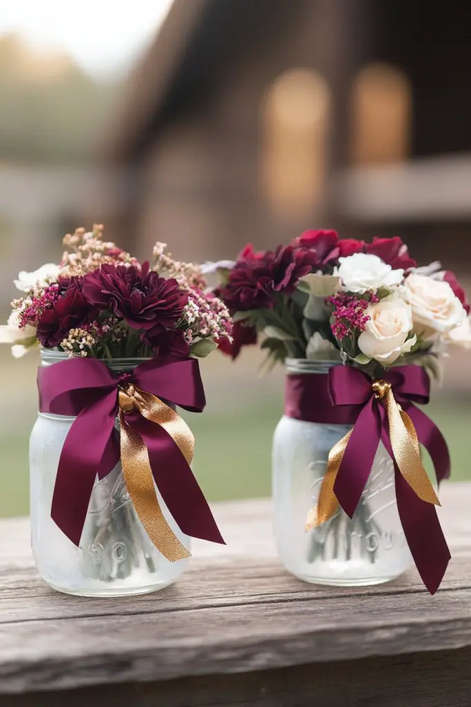 13. Burgundy and Gold Ribbon-Wrapped Mason Jars with Flower Blooms