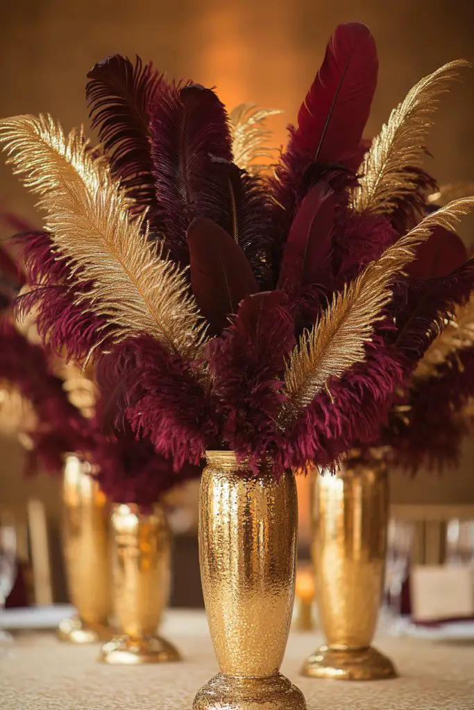Picture tall, slender gold vases holding dramatic arrangements of faux burgundy and gold feathers. The feathers fan out in dynamic shapes, creating movement and visual interest. Light reflects off the gold accents, while the deep burgundy adds richness. The arrangement feels both luxurious and avant-garde, suitable for fashion-forward events, themed parties, or artistic gatherings. The contrast of textures and colors makes it impossible to ignore.