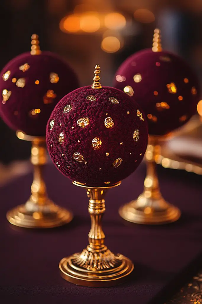 Want an elegant, portable centerpiece that can double as decor on tables or as hanging accents? Pomander balls in burgundy with gold accents are perfect for adding sophistication to any setting. Placed on decorative stands, they bring height and visual interest effortlessly. If you love classic, refined decor with a twist, this idea will inspire you.