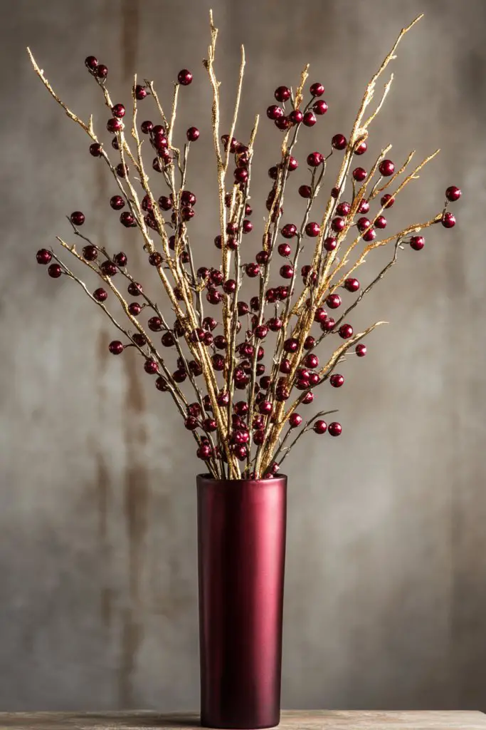 17. Gold Branches and Burgundy Faux Berries in a Tall Vase