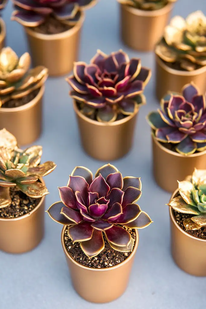 Picture small gold pots filled with thriving succulents in shades of burgundy, purple, and green. The pots have a metallic finish that reflects light, adding a subtle shimmer. Arrange them in a cluster or line across your table for a sleek, modern look. The succulent leaves curl and twist, creating interesting shapes and textures. The combination of rich hues and metallic shine exudes sophistication and freshness—perfect for a clean, minimalist aesthetic.