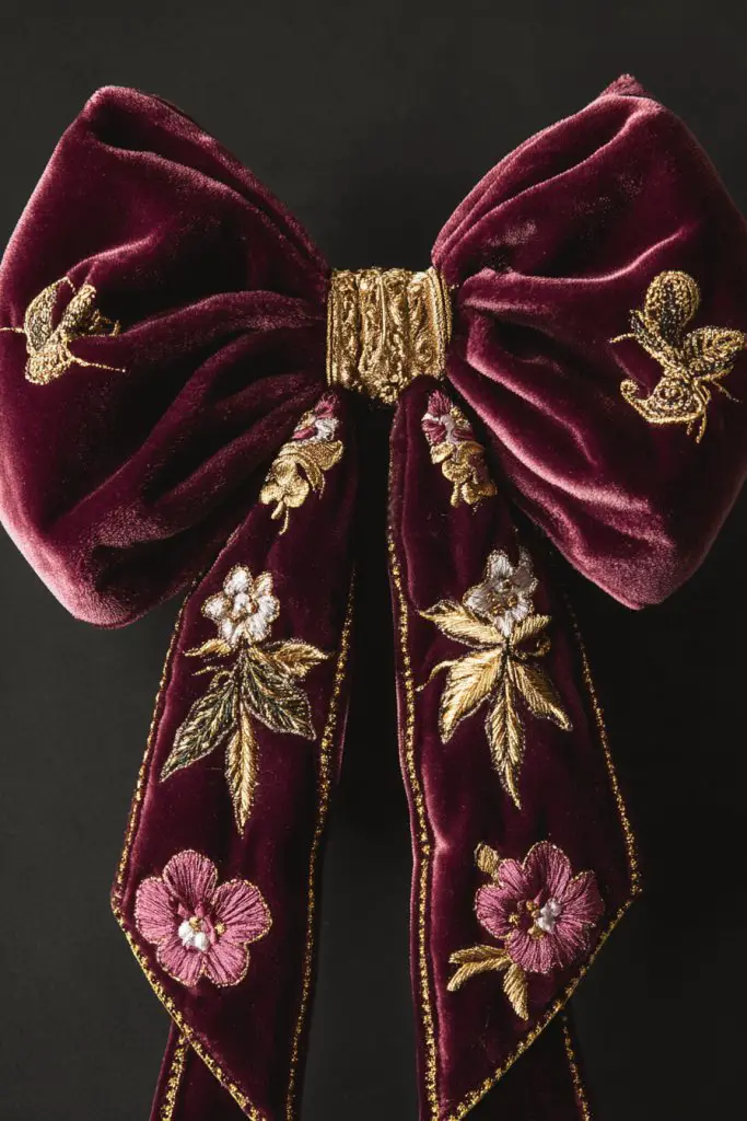 Visualize a grand velvet bow in deep burgundy with gold accents, carefully crafted with a floral design embedded into the fabric. The bow is large enough to serve as a focal point, with tails cascading down or looping around a central element. Faux floral appliqués in matching or contrasting colors add depth and artistry. The rich velvet feels soft to touch, while the embedded flowers add intricate detail. It’s a luxurious accent that combines craftsmanship with visual impact.